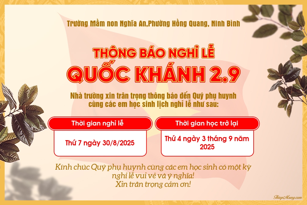 TRƯỜNG Mầm non NGHĨA AN XIN THÔNG BÁO📢📢📢 📢📢 LỊCH NGHỈ LỄ QUỐC KHÁNH 2/9